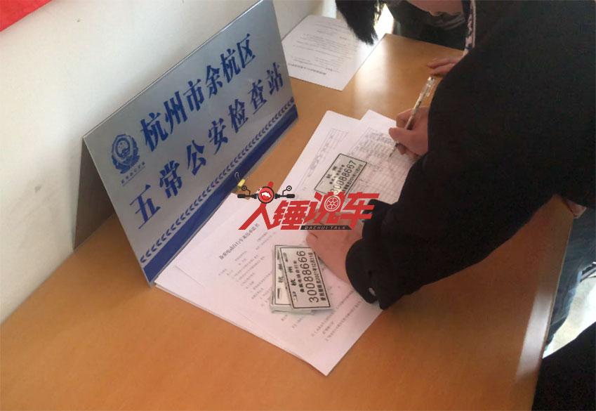 杭州地区指定上牌点有三类,一类是车管所的上牌管理处,一类是当地的指定公安检查站和派出所,还有就是路边的电动自行车安全教育点,这次我们去了附近的公安检查站进行电动车备案登记和上牌,手续十分简单,只需要出示您的身份证,认证一致,警察叔叔将你的身份证,车架号,手机号等信息记录后,只需车主在备案电动车承诺来历书上签字承诺该车为合法来源,并且在过渡期结束后不在杭州主城区范围内行驶即可,签字完成后,经常叔叔立马就给你安装备案登记牌照。整个过程5分钟不到就完成了!