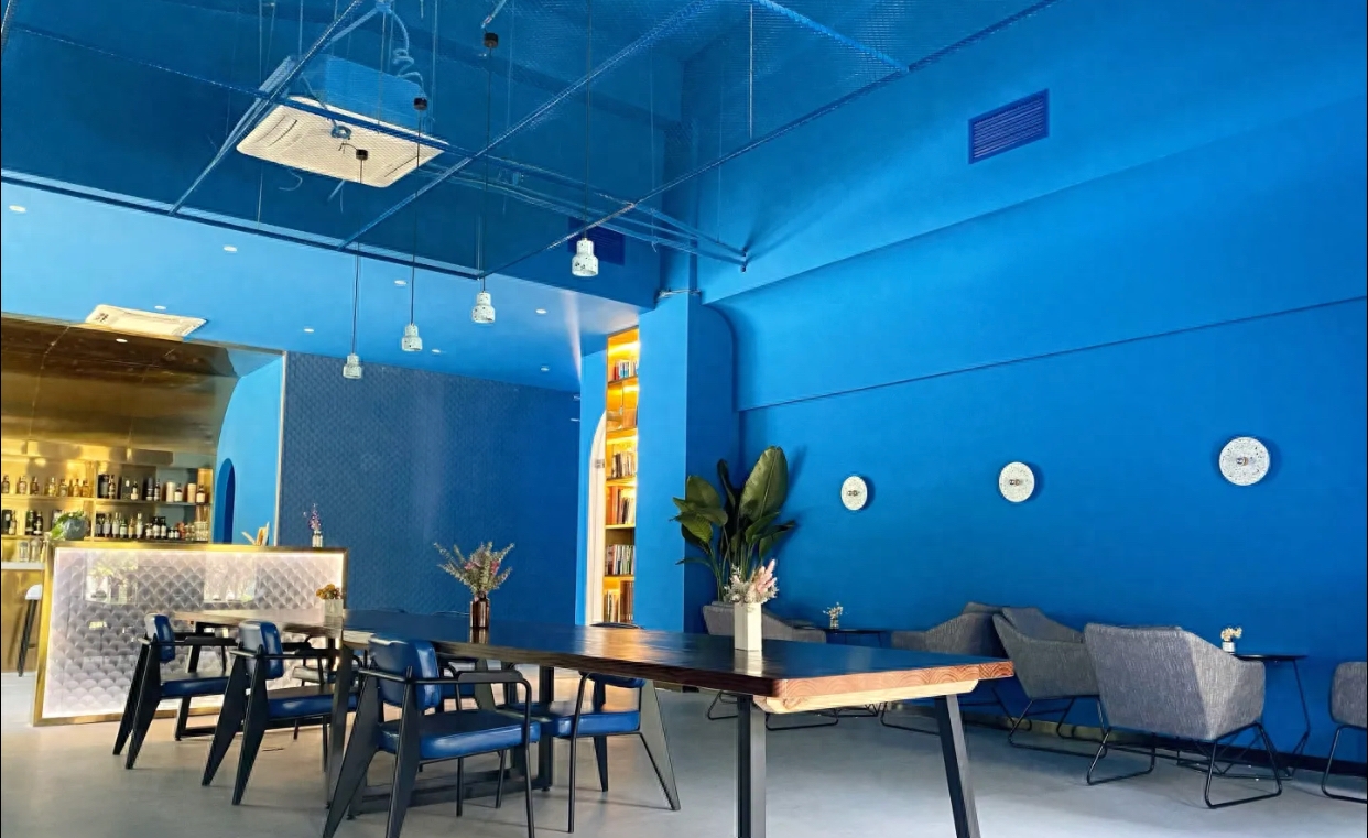 知也美术馆内还建有咖啡厅,看展累了可以在这个深蓝色的静谧空间里品一杯正宗美式咖啡,小憩片刻。