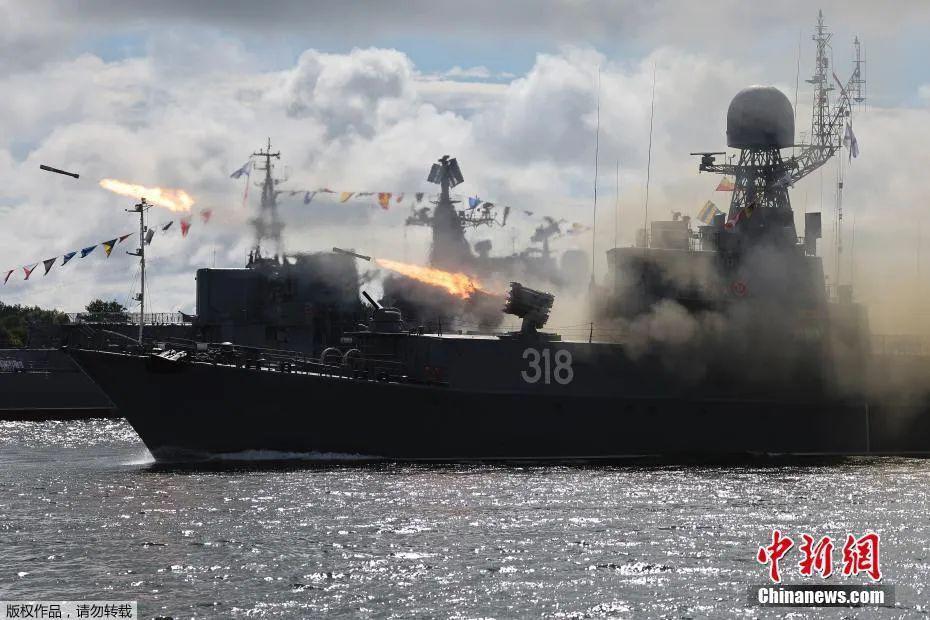 当地时间 7 月 28 日,俄罗斯波罗的海舰队基地举行海军节阅兵总彩排。图为一艘军舰发射反潜火箭。
