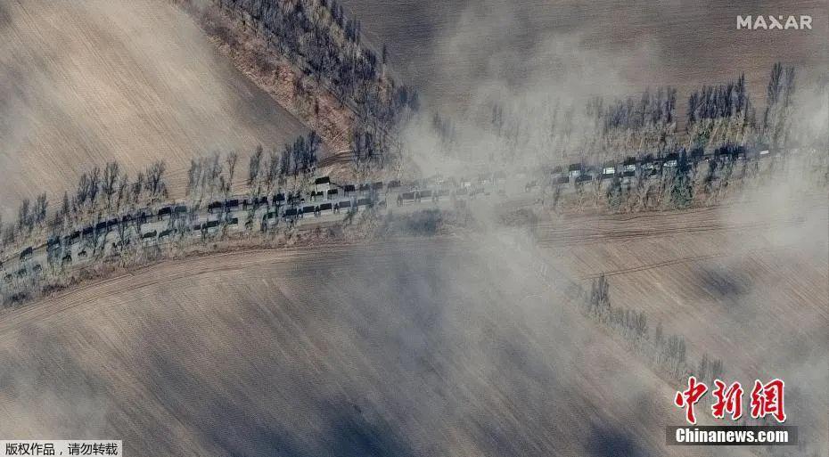 当地时间 2 月 27 日,卫星图像显示俄罗斯军车车队在伊万基夫郊区路上,向乌克兰首都基辅移动。