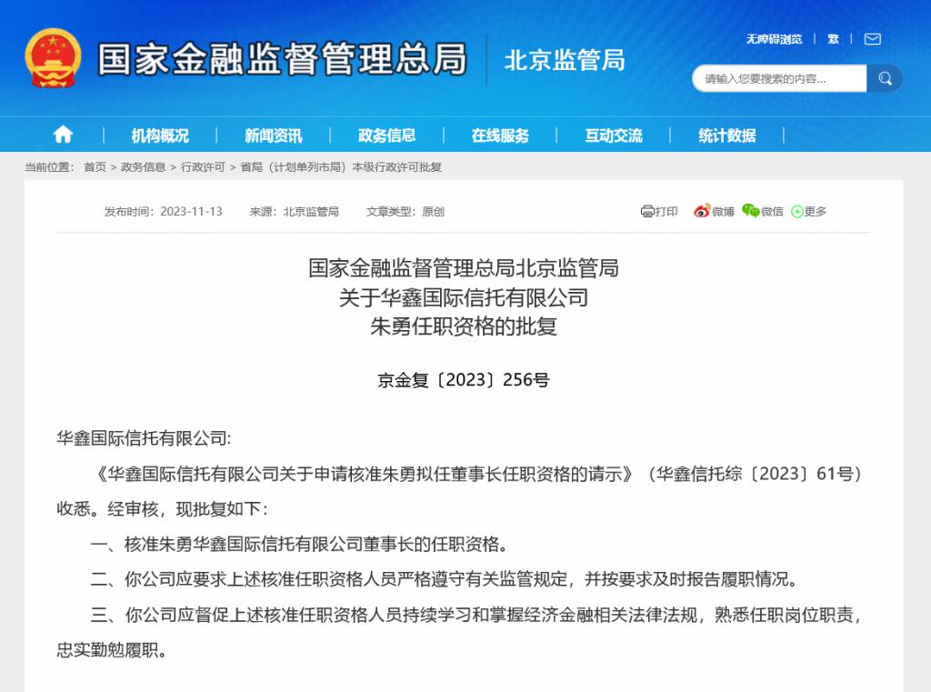 财联社记者从国家金融监督管理总局获悉,国家金融监督管理总局北京监管局日前核准了朱勇华鑫国际信托有限公司(下称华鑫信托)董事长的任职资格。