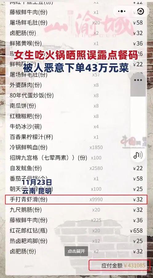 女孩吃火锅一个操作,被恶意下单 43 万元菜
