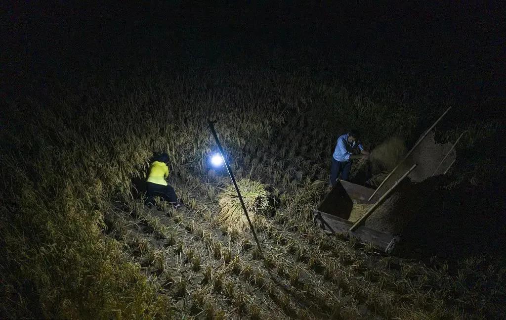 | 2022 年 8 月 17 日,四川阆中,老夫妻避高温,凌晨收获水稻。