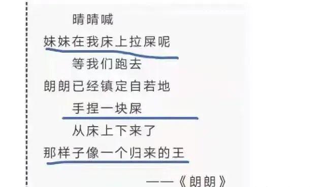 手上捏一块屎的朗朗像不像 " 一个归来的王 " 呢?天底下,有史以来哪位归来的王是手拿一块屎的呢?确实有点费思量。诗人的脑回路确实不同一般呢。