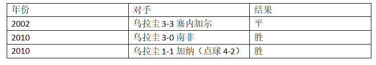 六、乌拉圭世界杯上面对非洲球队战绩取得2胜1平保持不败。