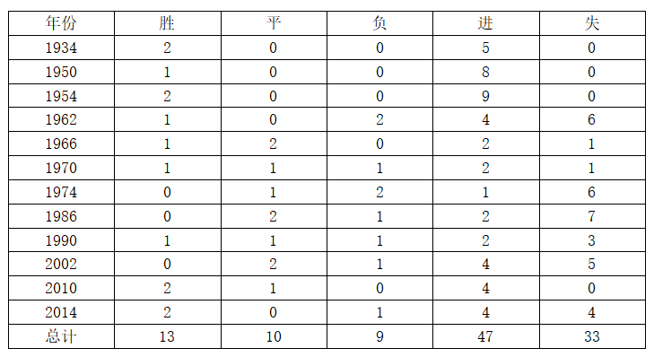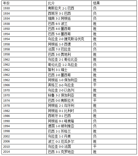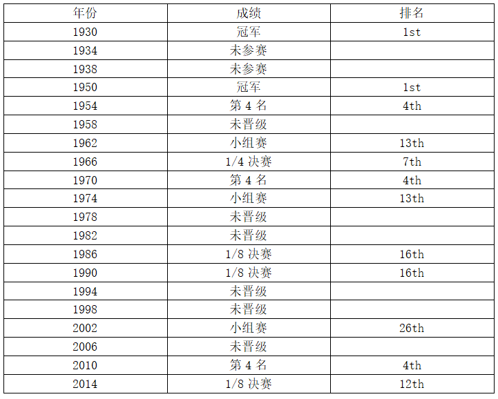 △乌拉圭世界杯历史上先进球的比赛取得15胜2平3负,3次输球分别是1962年1-3负于南斯拉夫、1970年1-3负于巴西和2014年1-3负于哥斯达黎加。