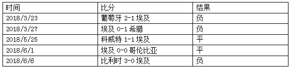△埃及在2018年进行的5场热身赛中未尝胜绩,2平3负,进2球失7球。