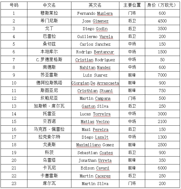 △乌拉圭总身价为3.72亿欧元,队中23名球员平均身价1620万欧元,其中身价超过1000万欧元的有希门尼斯、戈丁、本坦库尔、苏亚雷斯、托雷亚、贝西诺、拉克索尔特、戈麦斯和卡瓦尼9人。