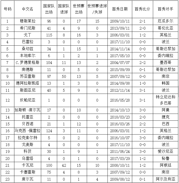△乌拉圭球员的平均国家队出场为41场。