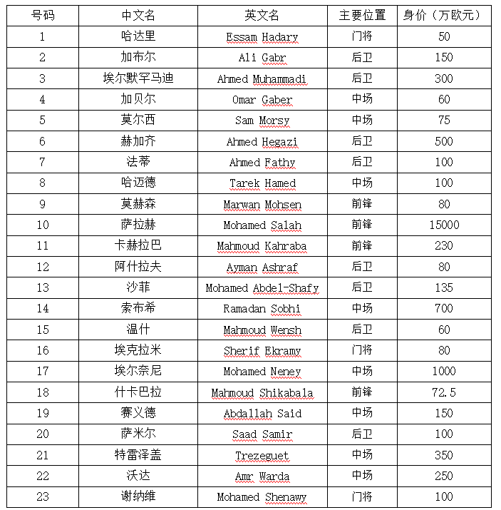 △埃及总身价为1.97亿欧元,队中23名球员平均身价858万欧元,其中身价超过1000万欧元的仅有埃尔奈尼和萨拉赫2人。
