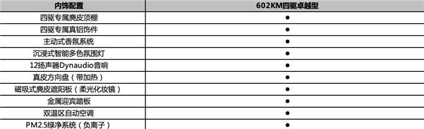 还配备真皮可加热方向盘、主动式香氛系统、沉浸式智能多色氛围灯、金属迎宾踏板、12 扬声器 Dynaudio(丹拿)音响,双温区自动空调配备 PM2.5 绿净系统。