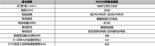 四驱卓越版电池包容量 87.04kWh,支持 140kW 安全升压直流快充,综合续航 602 公里。