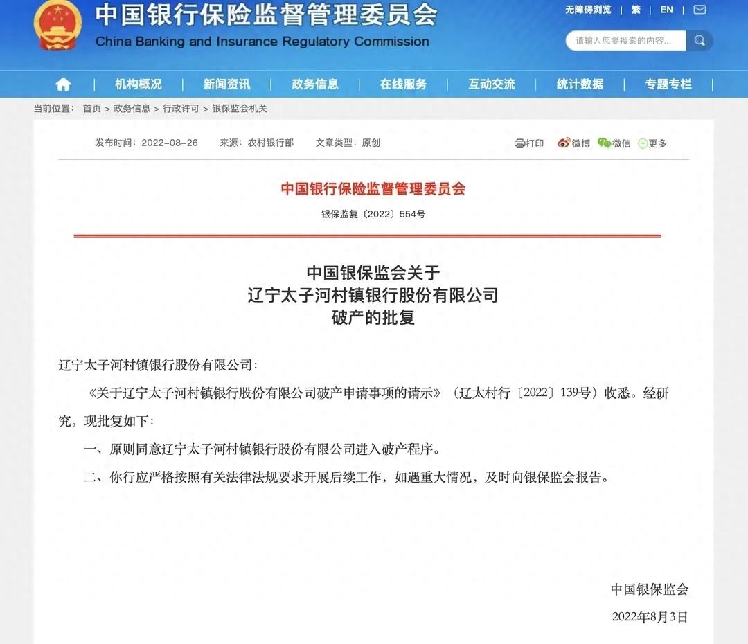 2022年8月26日,银保监会网站发布的两则批复显示,银保监会已原则同意辽宁的辽阳农村商业银行和辽宁太子河村镇银行进入破产程序。