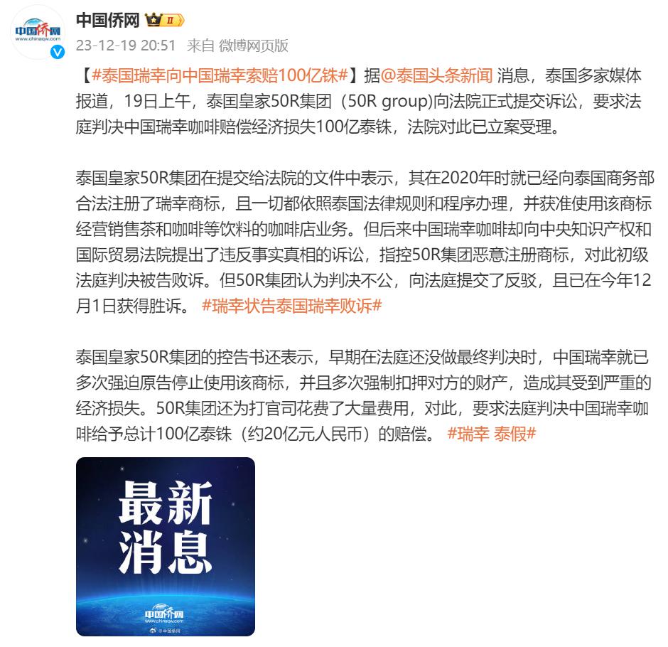 据 @泰国头条新闻 消息,泰国多家媒体报道,19 日上午,泰囯皇家 50R 集团(50R group ) 向法院正式提交诉讼,要求法庭判决中国瑞幸咖啡赔偿经济损失 100 亿泰铢,法院对此已立案受理。