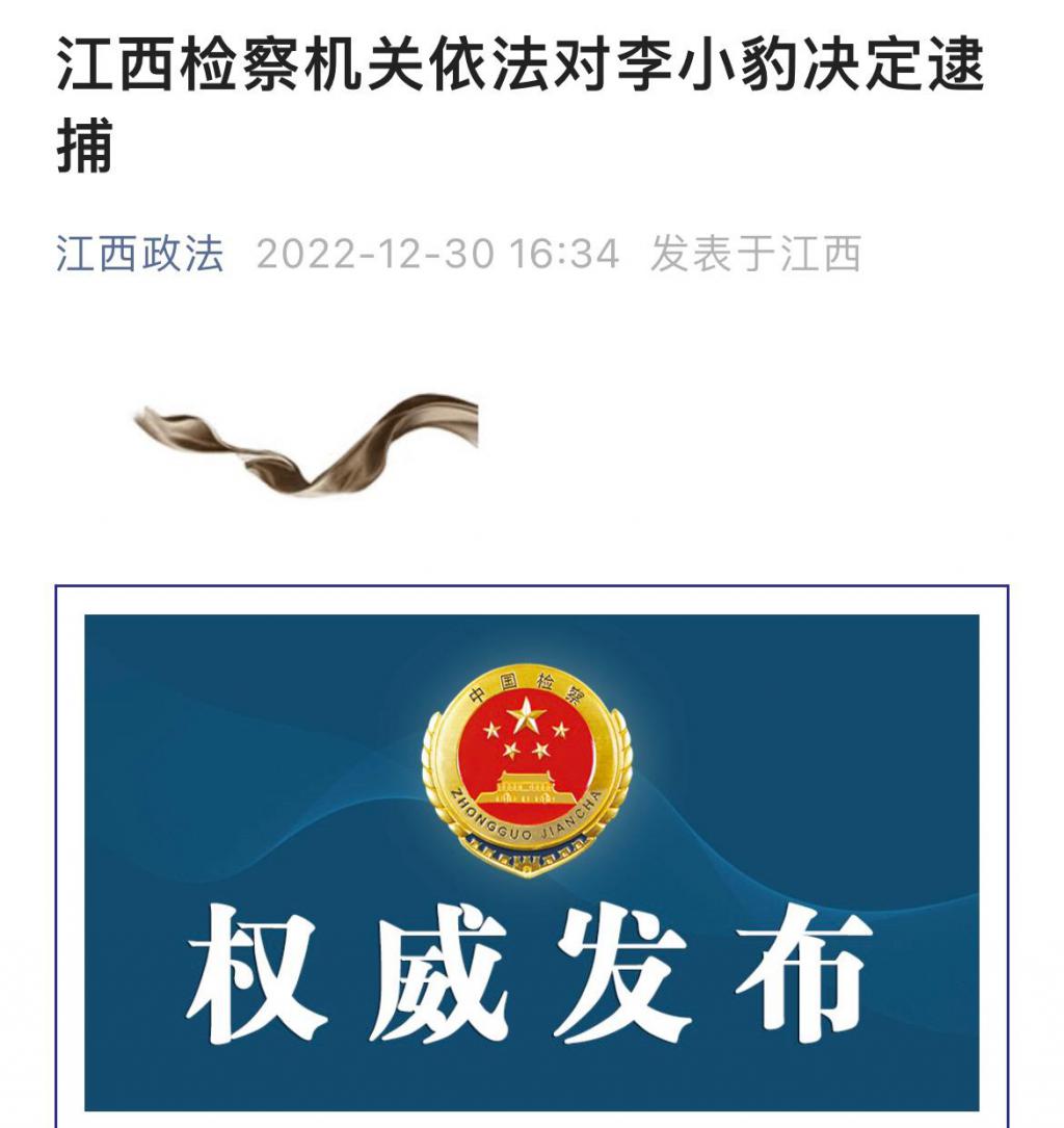 日前,宜春市人民检察院依法以涉嫌受贿罪对李小豹作出逮捕决定。案件正在进一步办理中。