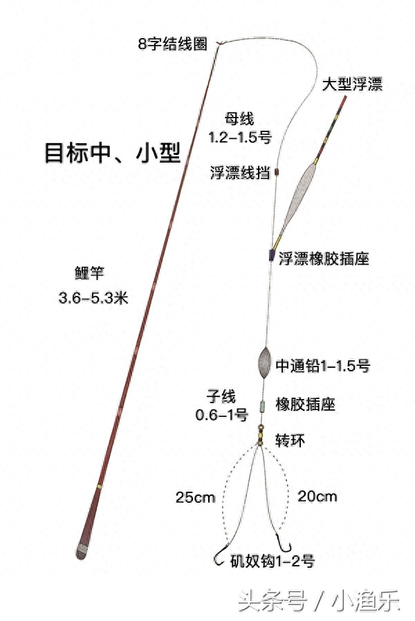 浮漂钓组是最基本也是使用最广泛的钓组,适合垂钓 鲫鱼,鲤鱼,草鱼,翘嘴等大部分淡水鱼类。下面我们就来看几种浮漂钓组,分为中小型鱼类的鲫竿和大中型鱼类的鲤竿