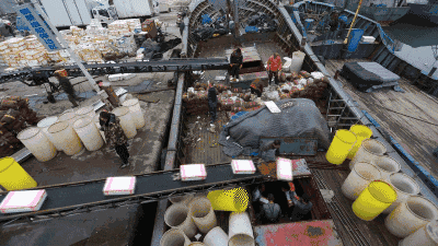 断桥旁,就是丹东比较繁华的沿江开发区,港口的早晨,是一天中最热闹的时候。渔民会在回程的路上,就把海鲜包装好,到岸之后直接送到冷藏车中,发往全国各地。