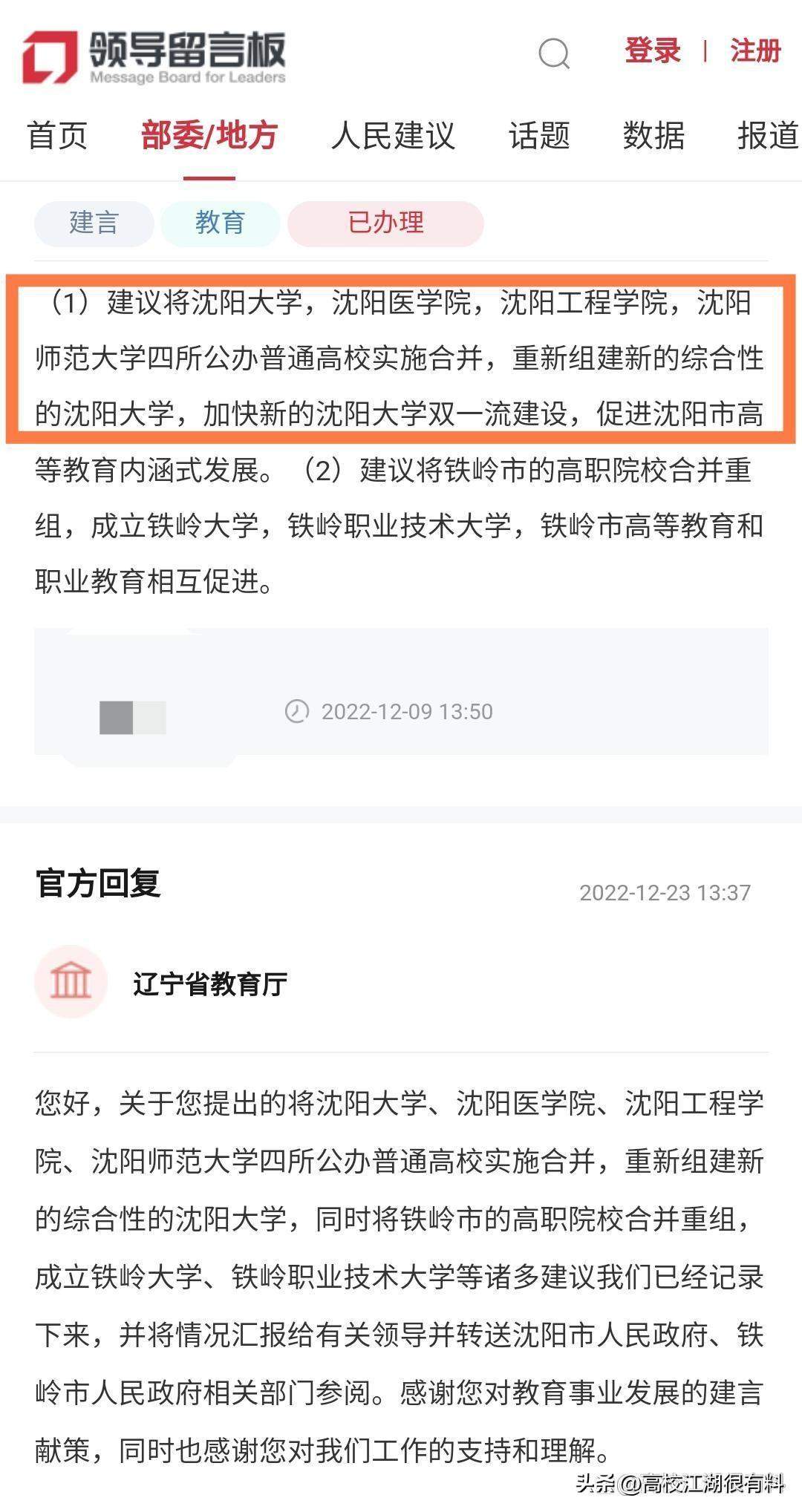 有网友建议:将沈阳大学,沈阳医学院,沈阳工程学院,沈阳师范大学4所公办普通高校实施合并,重新组建新的综合型的沈阳大学,加快新的沈阳大学双一流建设。而辽宁省教育厅近期也做出了回复,表示已经进行了记录,已经转交有关部门参阅。