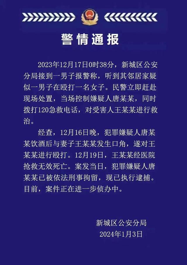 内蒙古自治区呼和浩特市土默特左旗发生的一起家暴致死案件引发广泛关注。据呼和浩特市公安局新城区分局 1 月 3 日通报:2023 年 12 月 16 日晚,犯罪嫌疑人唐某某饮酒后与妻子王某某发生口角,遂对王某某进行殴打。19 日,王某某经医院抢救无效死亡。案发当日,犯罪嫌疑人唐某某已被依法刑事拘留,现已执行逮捕。目前,案件正在进一步侦办中。