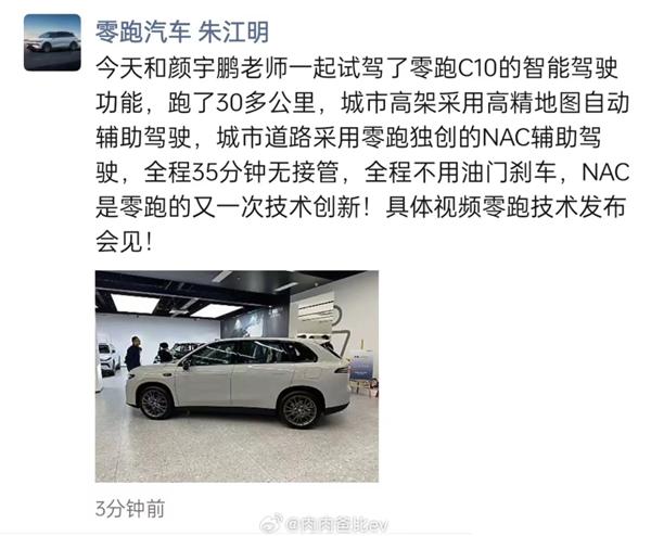 零跑 CEO 朱江明日前也在朋友圈发文表示,采用零跑独创 NAC 辅助驾驶的零跑 C10,在市区内行驶了 30 多公里,全程不用油门刹车,全程 35 分钟没有一次接管,NAC 将会是零跑的又一次技术创新。