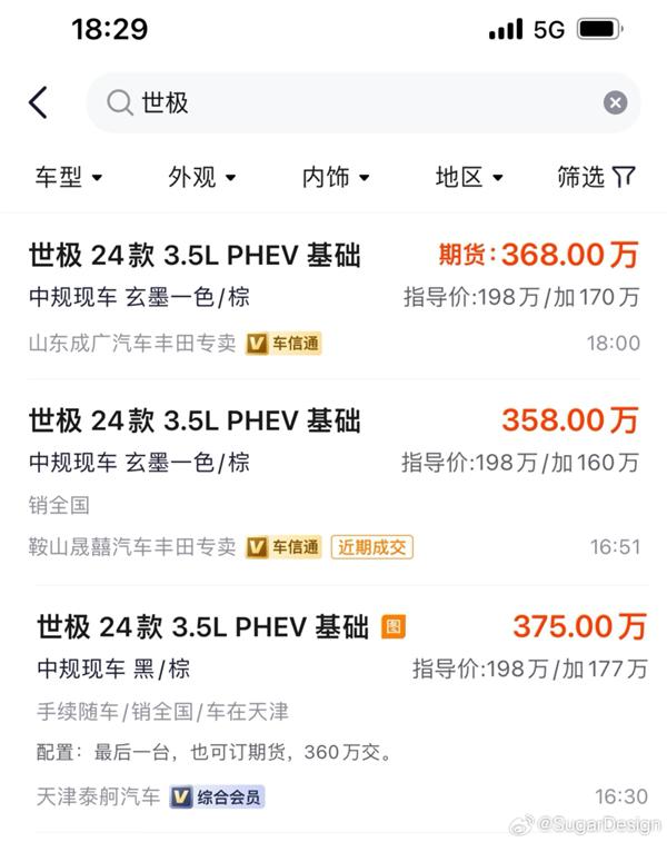 那么是什么车呢?没错,正是丰田全新的世极 SUV,近日一台上了绿牌的新车被网友拍到,而在交易平台上可以看到,这台车的官方指导价为 198 万元,但加价 170 万,落地轻松超过 350 万。