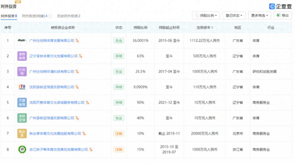 根据记者检索某查查信息显示,李铁对外投资 8 家公司,其中目前有 2 家注销,6 家存续。