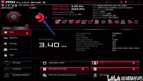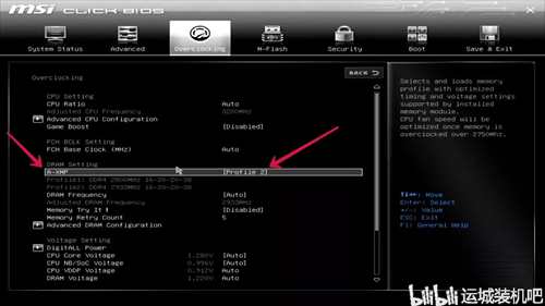 - 微星红色界面相比黑色界面更便捷- 进入BIOS,点击XMP按钮(从OFF点击为ON)- 点击后可选1或2 两个预设配置模式