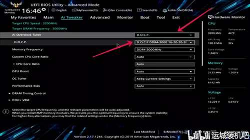 打开BIOS,进入高级模式- 打开AI Tweaker选项卡- 在AI Overclock Tuner 中选择DOCP- 允许选择一个预设超频档案- 选择XMP预设参数