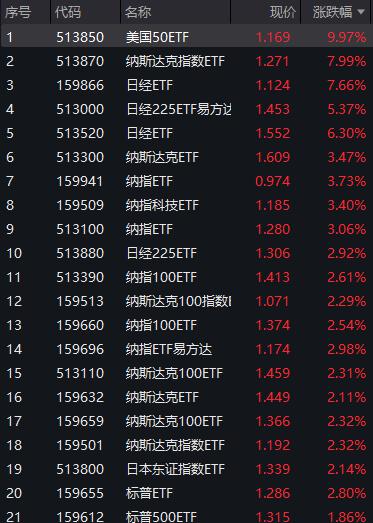 除了以上这些,今天还有一类标的在大涨——跨境 ETF,它们的特点就是" 不跟 A 股行情 ",其中美股和日股相关 ETF 居多。