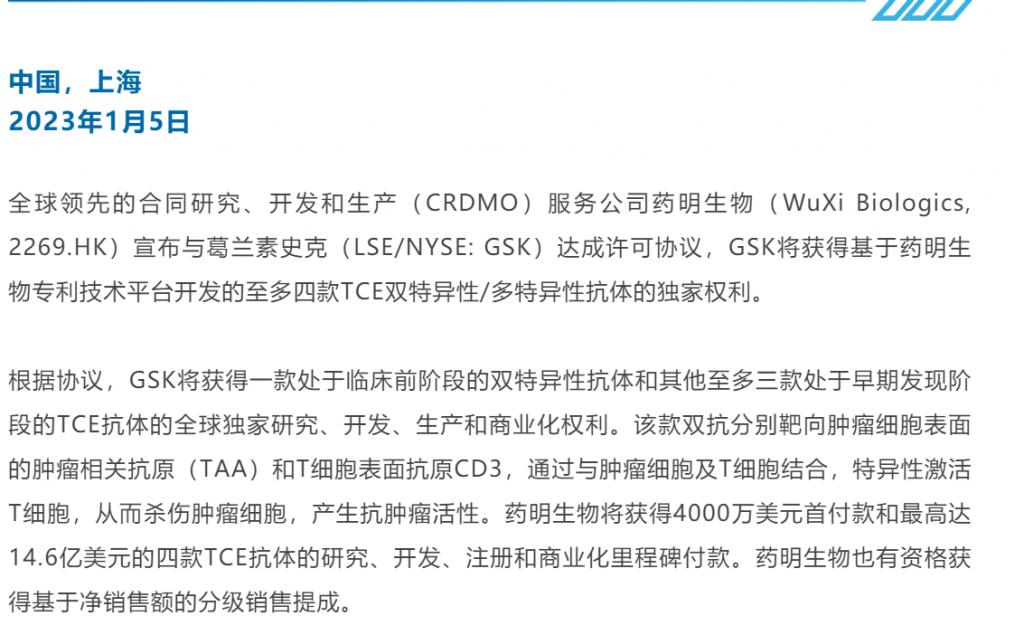 协议中还提及药明生物将获得 4000 万美元首付款和最高达 14.6 亿美元的四款 TCE 抗体的研究、开发、注册和商业化里程碑付款。药明生物也有资格获得基于净销售额的分级销售提成。