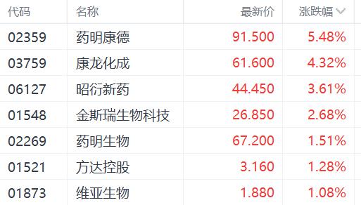财联社 1 月 5 日讯(编辑 胡家荣)今日港股医药外包概念股早盘大幅一度大幅走强,其中药明康德 ( 02359.HK ) 、康龙化成 ( 03759.HK ) 、昭衍新药 ( 06127.HK ) 、药明生物 ( 02269.HK ) 分别上涨 5.48%、4.32%、3.61%、1.51%。