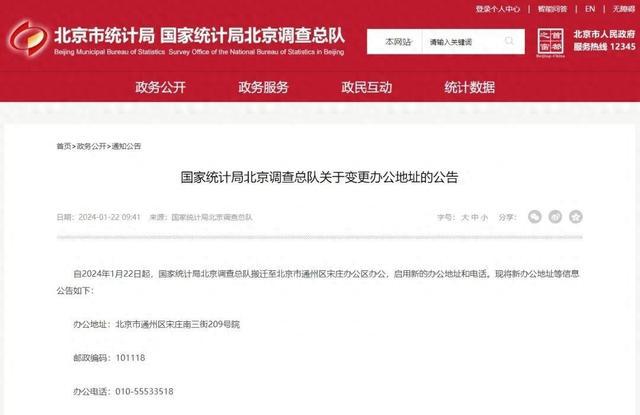 国家统计局北京调查总队自2024年1月22日起搬迁至北京市通州区办公