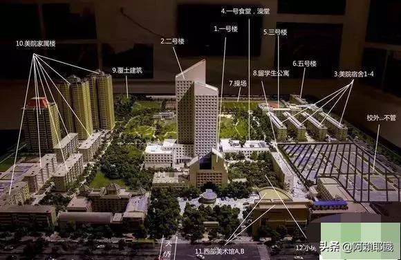 美院猪蹄大楼以前是一个美术的美字造型,猪蹄中间以前是没有蓝玻璃的,是个平台,这样就是美字的最上面。