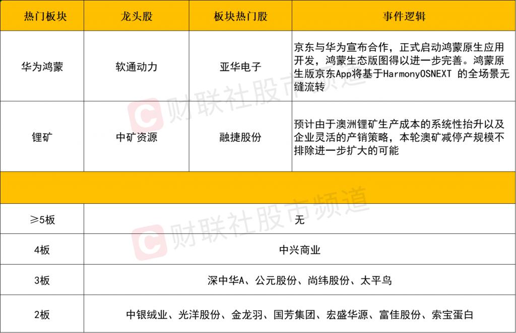板块上,华为鸿博概念全线爆发,亚华电子、创识科技双双 20CM 涨停,九联科技、软通动力、科蓝软件涨超 10%,常山北明、华立股份、智微智能、传智教育、延华智能等个股涨停。消息面上,1 月 18 日,华为将举办鸿蒙重要活动,届时将揭秘鸿蒙生态和 HarmonyOS NEXT 进阶新篇章。此外,昨日京东与华为宣布合作,正式启动鸿蒙原生应用开发,鸿蒙生态版图得以进一步完善。在 " 官宣 " 与京东的合作之前,华为已相继与美团、新浪、小红书、哔哩哔哩、支付宝等互联网头部企业宣布合作。