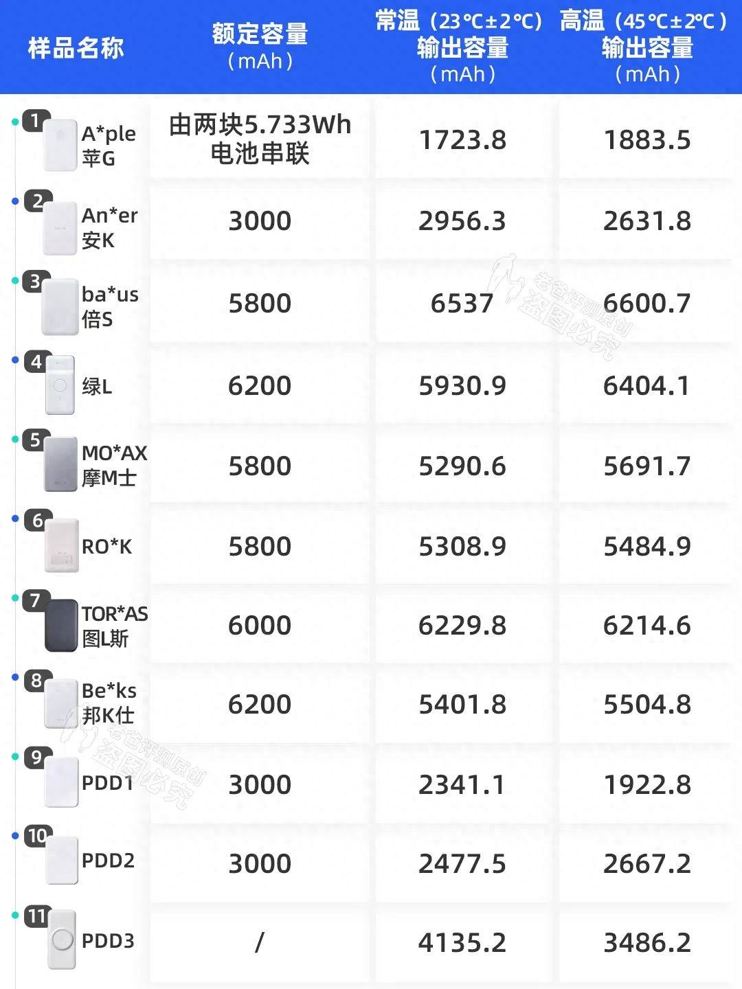 我们委托专业实验室,测试了 11 款样品在常温(23 ℃ ± 2 ℃)、高温(45 ℃ ± 2℃ )、低温(-10℃ ± 2 ℃)环境下的有效输出容量,来模拟它们在