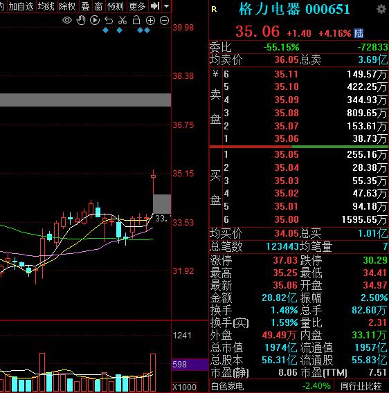 1 月 29 日,格力电器股价应声上涨,截至收盘,报 35.06 元,涨 4.16%,总市值 1974 亿元。