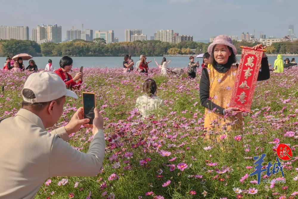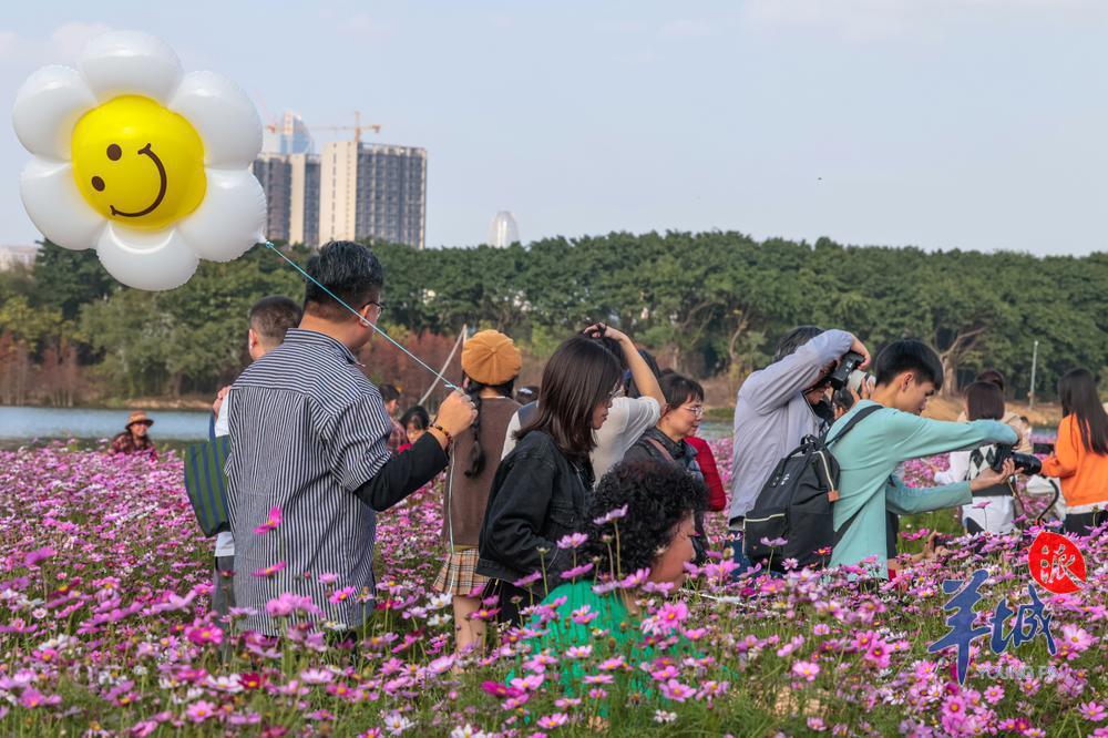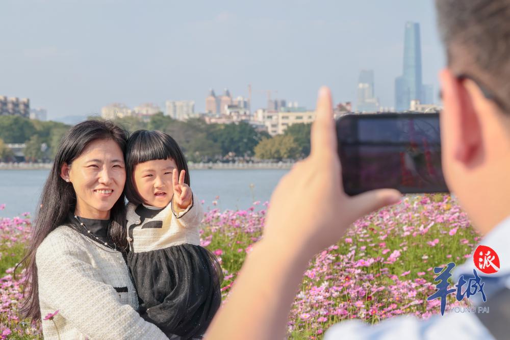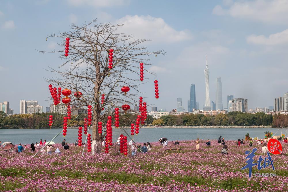 2024 年 2 月 14 日,天气晴间多云。海珠湖公园内,不少市民结伴来到花畔塔影景点踏青。