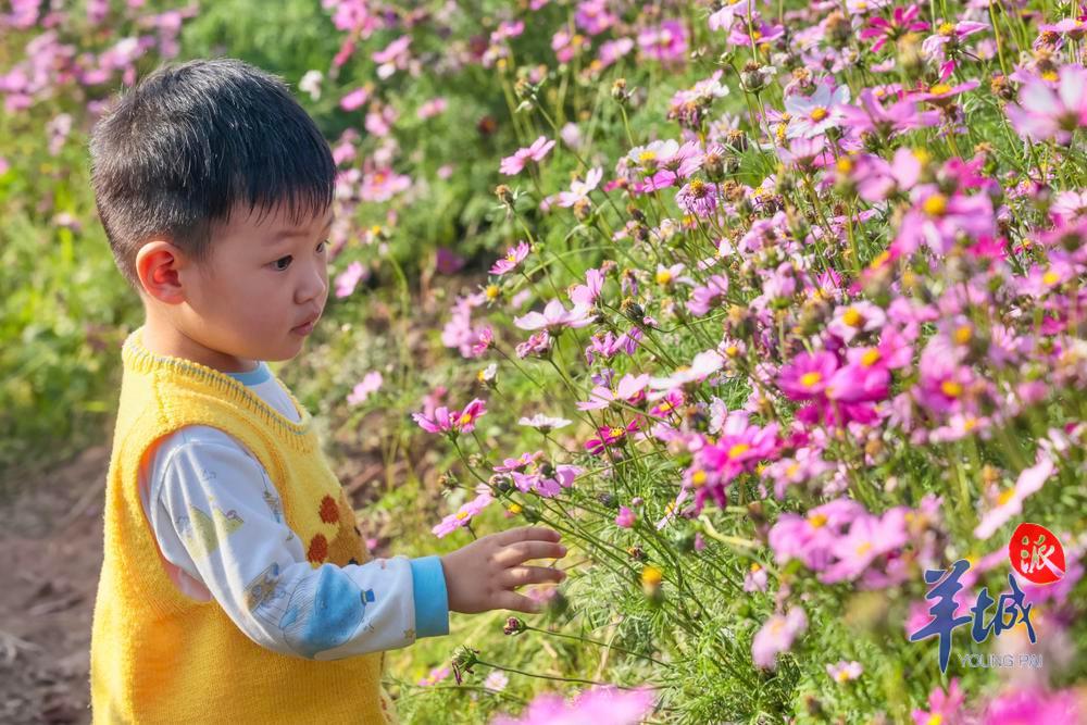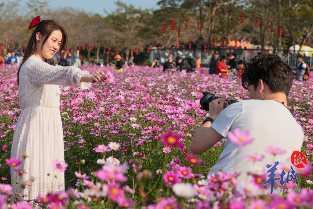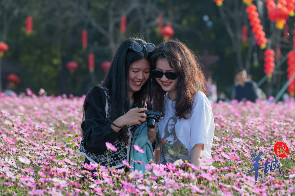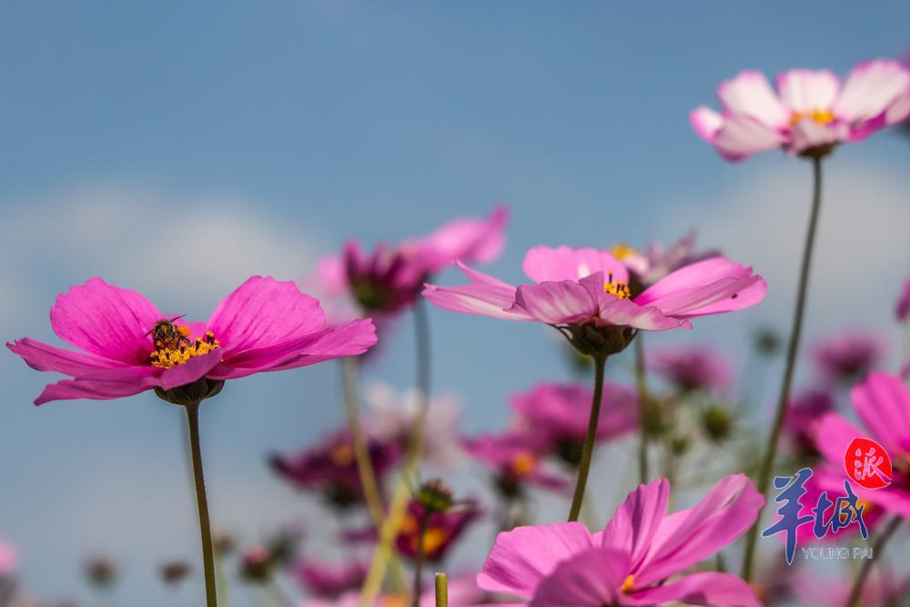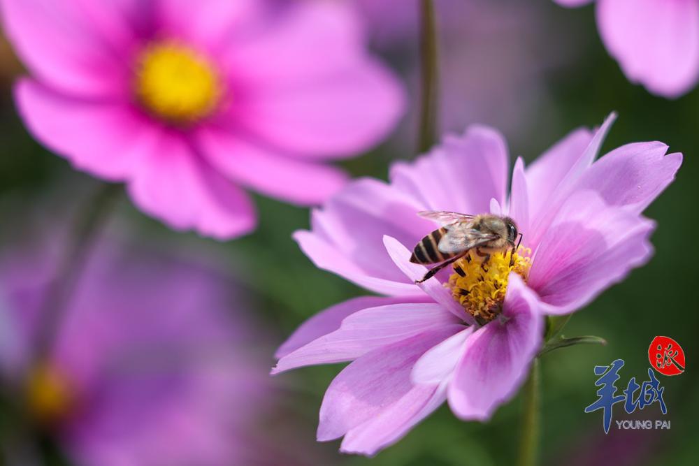 人们穿梭于片片盛开的格桑花海之中,时而驻足观赏时而举起相机定格下这如诗如画的场景。盛开的格桑花吸引了不少蜜蜂前来采蜜,现场一片春意盎然的景象。