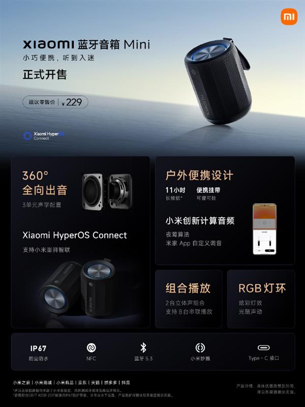 229元 小米蓝牙音箱Mini开售:360°全向出音、接入澎湃智联