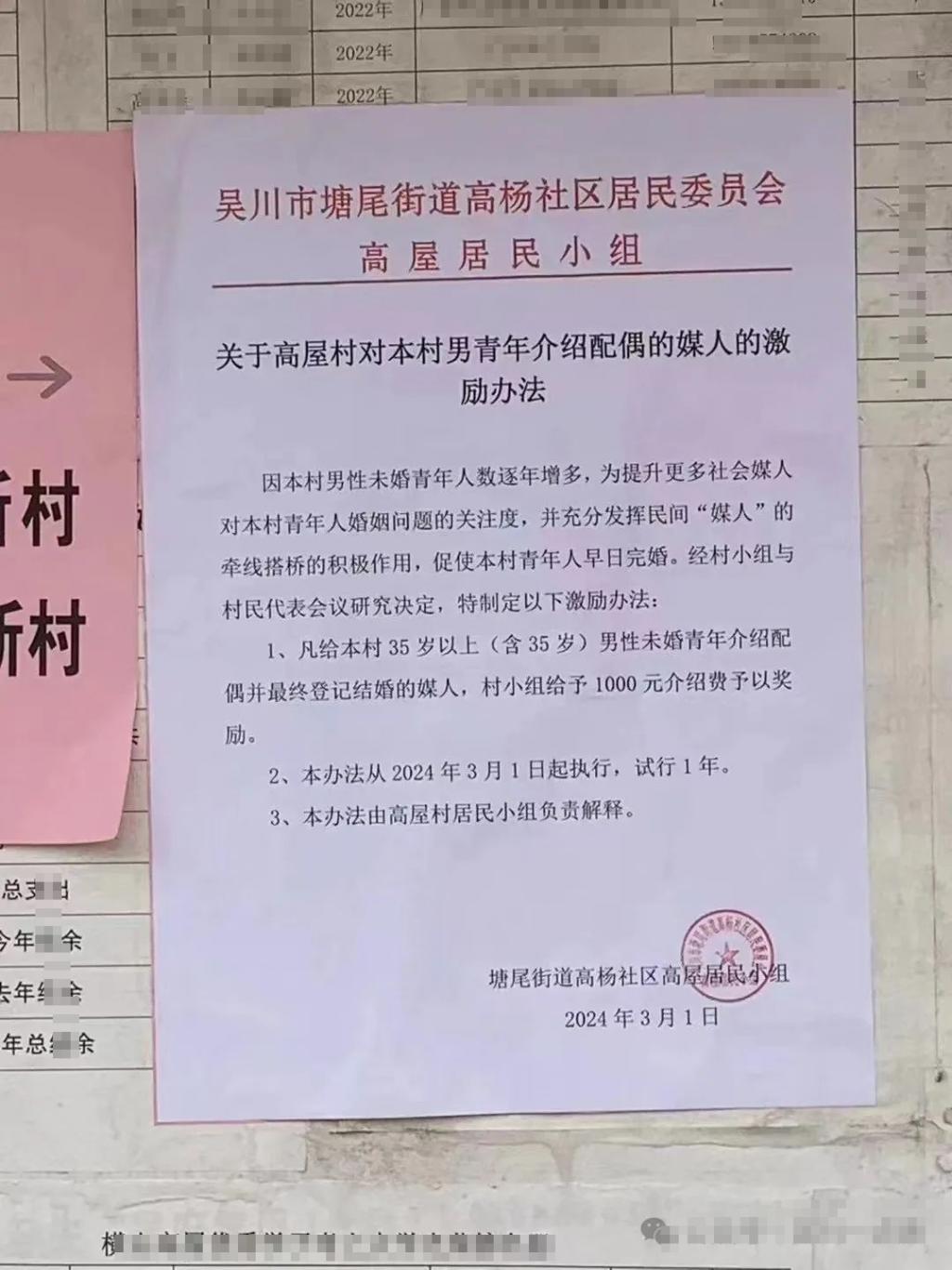 吴川市塘尾街道高杨社区居民委员会高屋居民小组发布《关于高屋村对本村男青年介绍配偶的媒人的激励办法》,文件显示:因本村男性未婚青年人数逐年增多,为提升更多社会媒人对本村青年人婚姻问题的关注度,并充分发挥民间 " 媒人 " 的牵线搭桥的积极作用,促使本村青年人早日完婚。经村小组与村民代表会议研究决定,特制定以下激励办法:凡给本村 35 岁以上 ( 含 35 岁 ) 男性未婚青年介绍配偶并最终登记结婚的媒人,村小组给予 1000 元介绍费予以奖励。本办法从 2024 年 3 月 1 日起执行,试行 1 年。