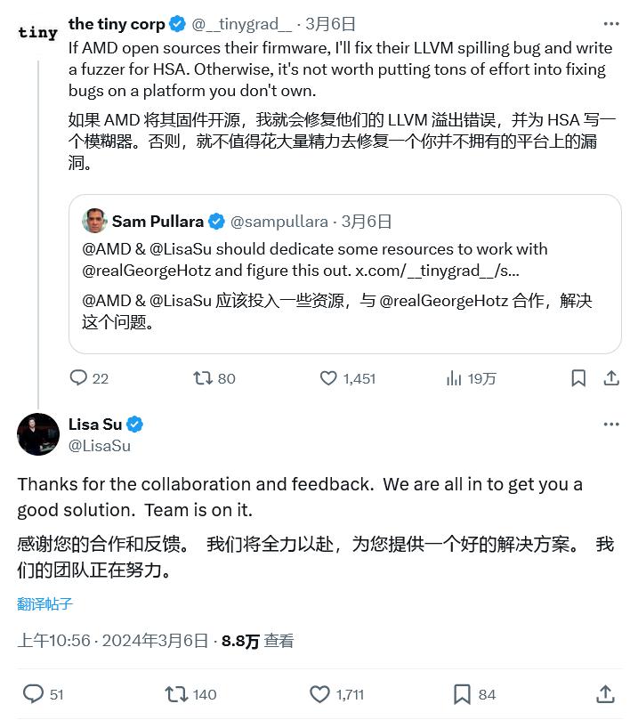 Hotz 的抱怨得到了 AMD 高层的重视,Lisa Su 博士回复了以下信息:"感谢您的合作和反馈。我们将全力以赴,为你提供一个好的解决方案。我们的团队正在努力解决这个问题 "。