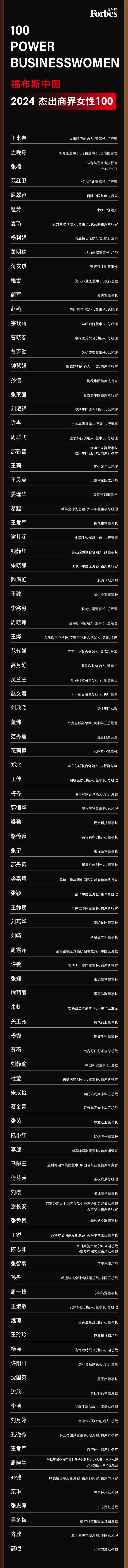 据福布斯中国介绍,今年,福布斯中国仍以国内上市公司女性管理者、入选 " 福布斯全球 2000 强 " 的跨国公司在华女性领导人,以及独角兽企业女性创始人为研究对象,通过对候选人所领导业务经营业绩、资本市场表现、市场规模、行业影响力、创新力等数据分析,从上千位候选人中遴选出最终 100 人。