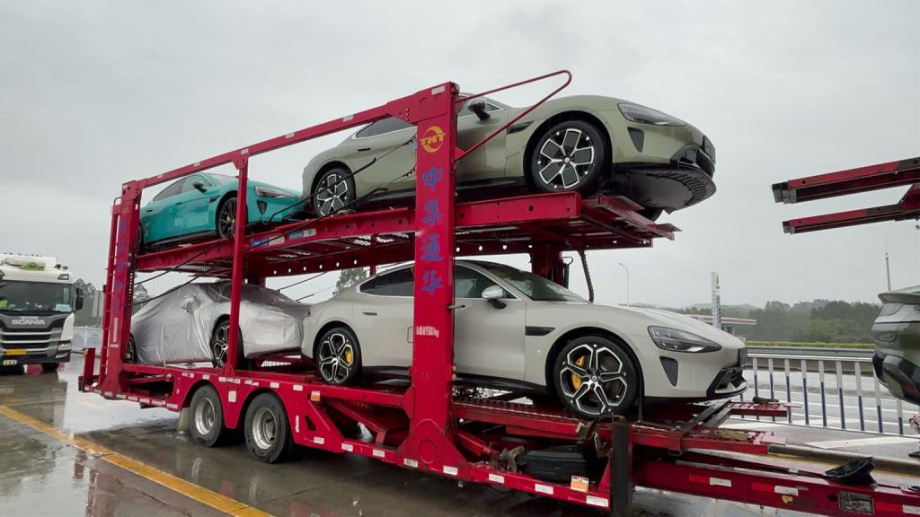 谍照显示多台小米 SU7 汽车已在运输途中:可见蓝灰绿三种配色款