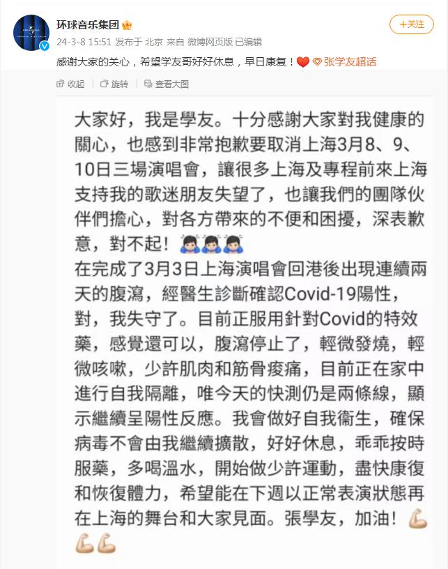 3 月 8 日下午,张学友通过环球音乐集团官方微博回应上海演唱会取消一事。他表示,经医生诊断确诊为新冠阳性,轻微发烧咳嗽,正在家自我隔离,并希望下周能以正常表演状态在上海的舞台和大家见面。