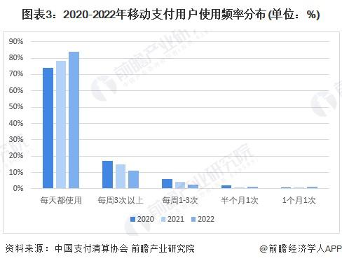 从用户的使用频率来看,2020-2022 年,每天都使用移动支付的用户占比不断提升,2022 年超八成的用户每天都使用移动支付,移动支付已成为人们日常生活中不可或缺的支付方式。