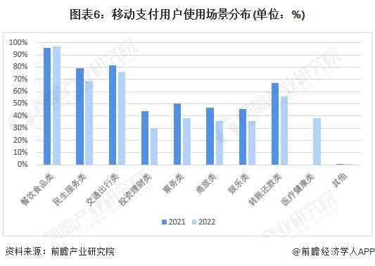 从移动支付的使用场景来看,餐饮食品类、民生服务类、交通出行类及转账还款类场景的移动支付渗透率较高 ; 此外,医疗健康类也已成为移动支付主流使用场景之一。