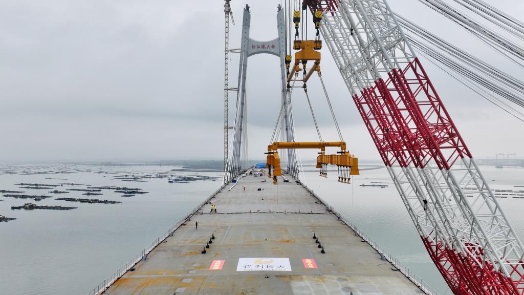 自 2022 年阳江港大桥主桥桩基施工以来,项目团队从技术创新简单化、设备选型智能化入手,以先进技术保障施工推进,并自主研发了双向液压调节吊具、运用了广东第一台起重量 240 吨超大型塔吊、建立了 24 小时气象监测站等新设备确保施工。最终阳江港大桥主桥从桩基开钻至钢箱梁合龙时间仅 23 个月。