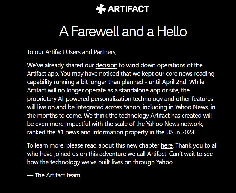 后续,Artifact 将不再作为独立 App 运营,其 AI 技术以及其他功能将在未来几个月内整合到雅虎旗下产品中,包括雅虎新闻。