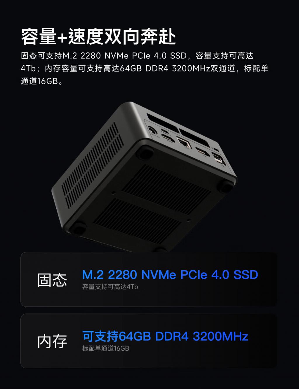 内部扩展性层面,该迷你主机支持 M.2 2280 NVMe PCIe 4.0 SSD、双通道 DDR4 3200 SO-DIMM 内存,最高可支持 64GB 容量。