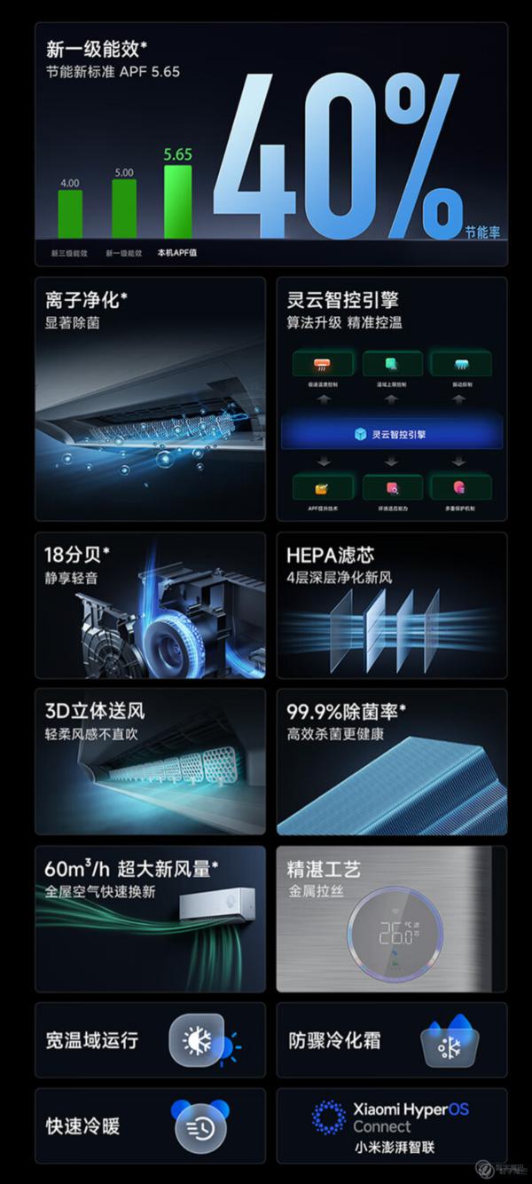 此外,该空调配有灵云智控引擎,可实现极速温度控制、温域上限控制、振动抑制等功能。同时,该空调支持小米澎湃智联,可通过米家 App、小爱同学进行操控。